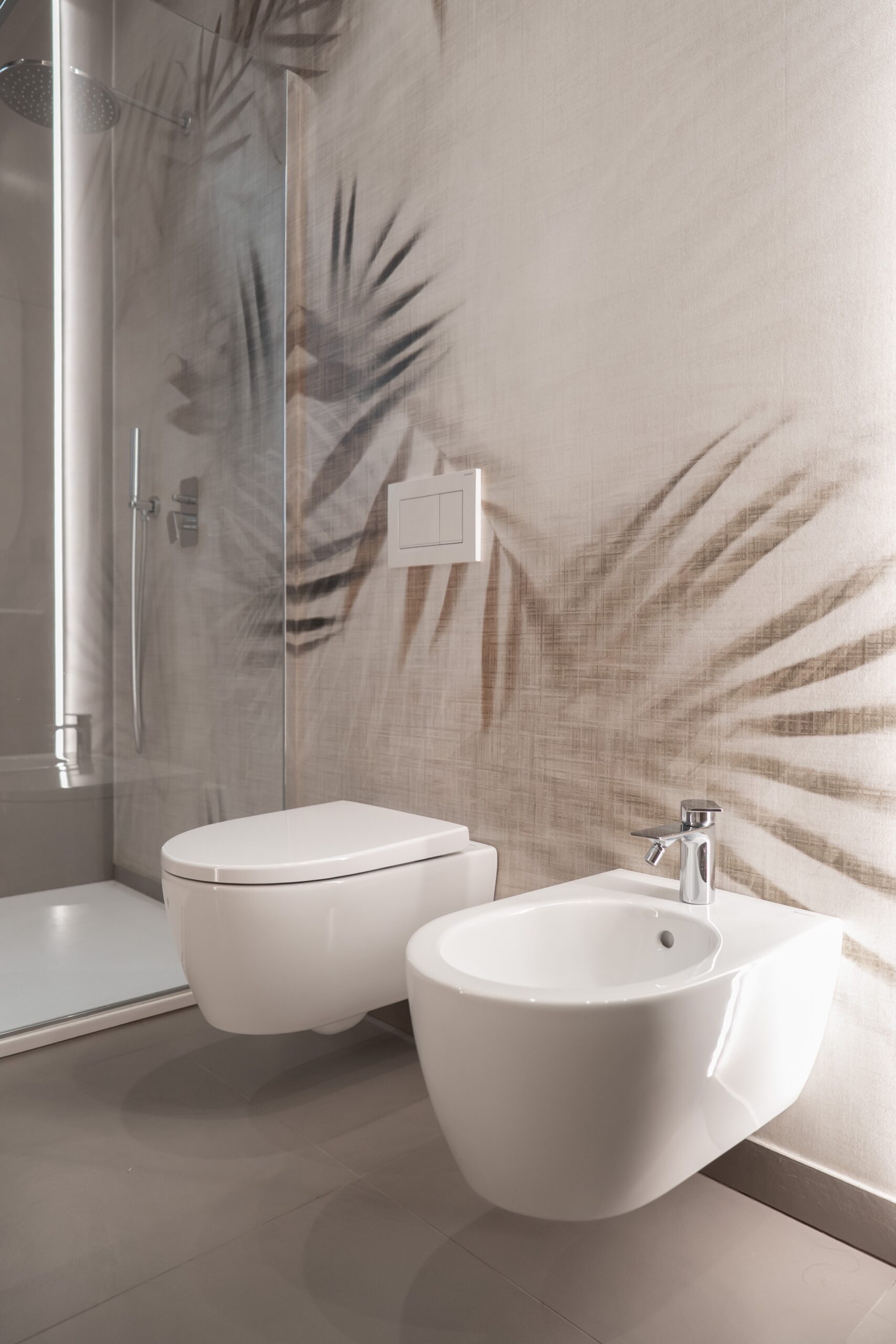 La composizione dialoga perfettamente con le linee essenziali dei sanitari sospesi, con le superfici pulite e con i materiali contemporanei dell’ambiente. La carta da parati diventa così un elemento capace di dare identità al progetto, introducendo profondità visiva e una raffinata continuità estetica.