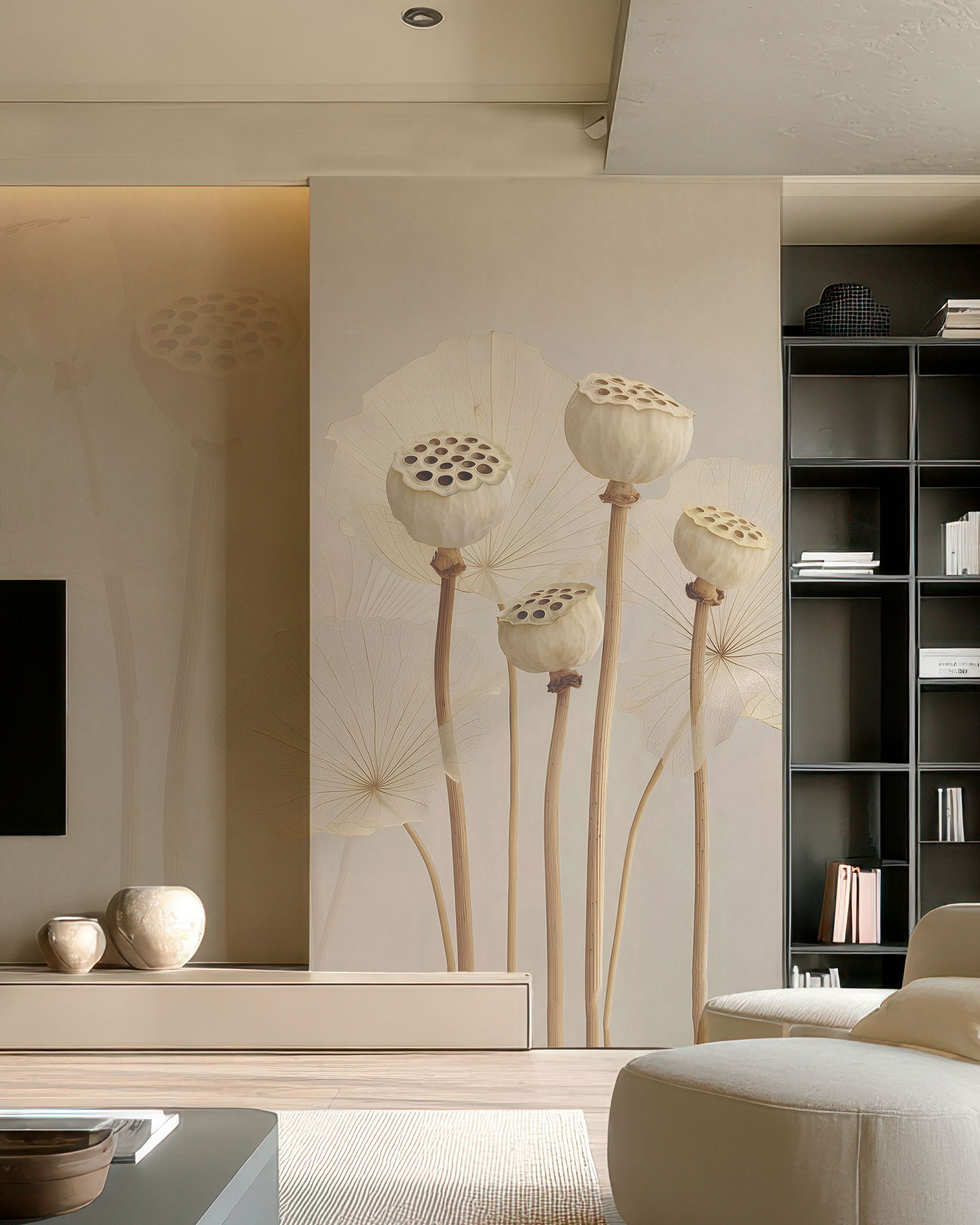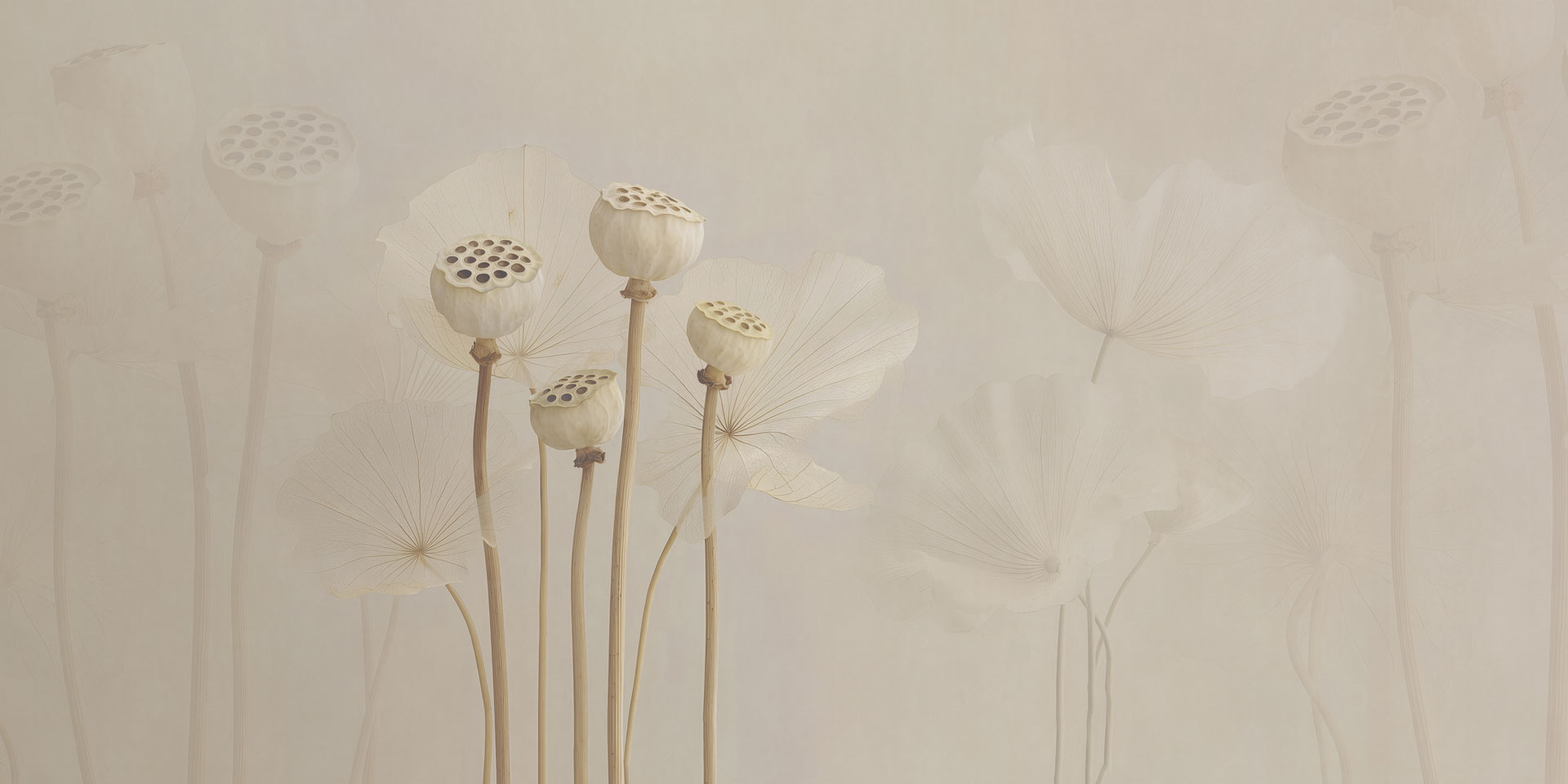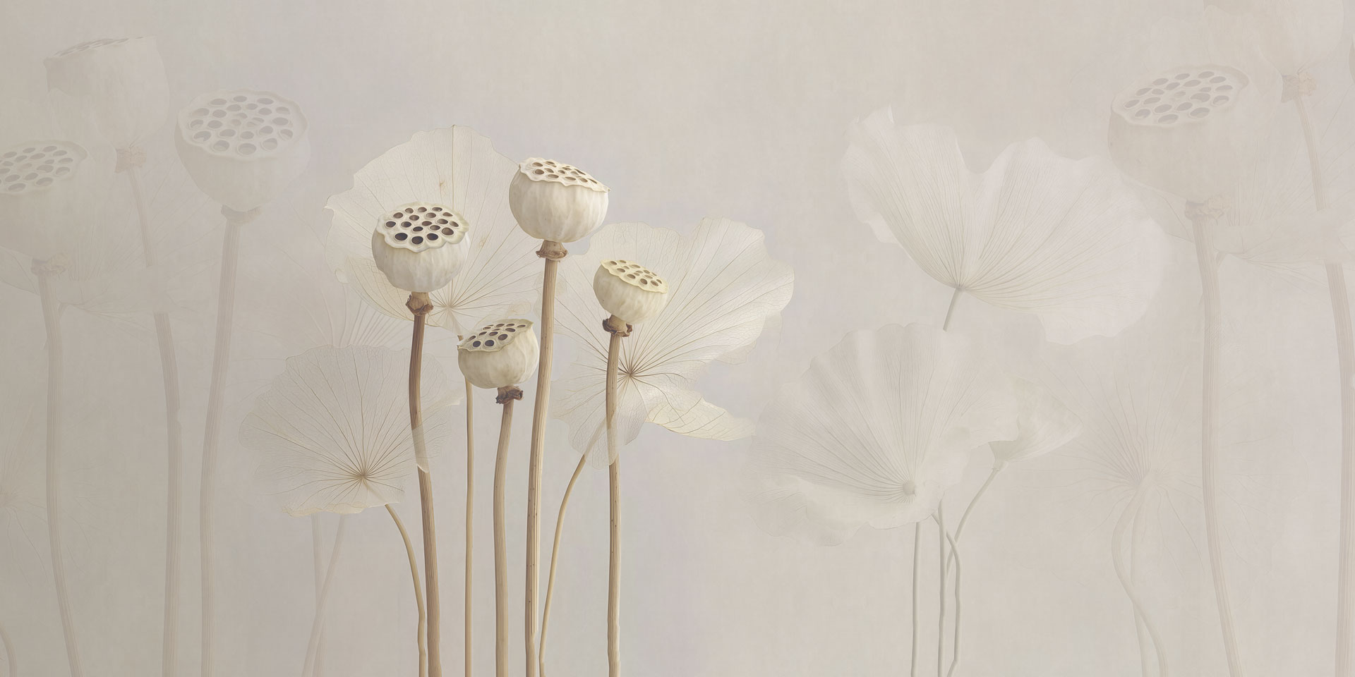 Navajo è una carta da parati che interpreta il mondo naturale attraverso una composizione morbida e contemplativa. Gli elementi botanici emergono con estrema leggerezza, come sospesi nello spazio, evocando un’immagine silenziosa e rarefatta.