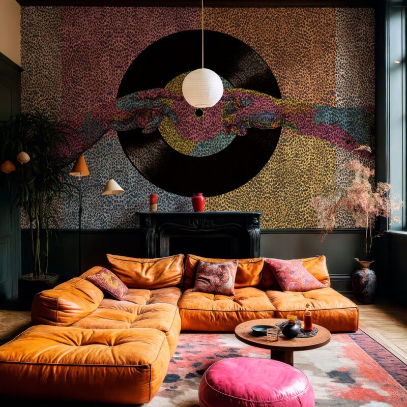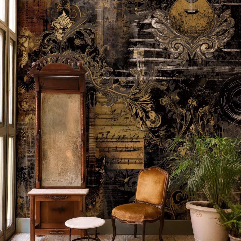 Le sagome delle foglie emergono sulla superficie creando una composizione morbida e continua. Il disegno accompagna lo spazio senza dominarlo, contribuendo a definire un’atmosfera raccolta e raffinata.